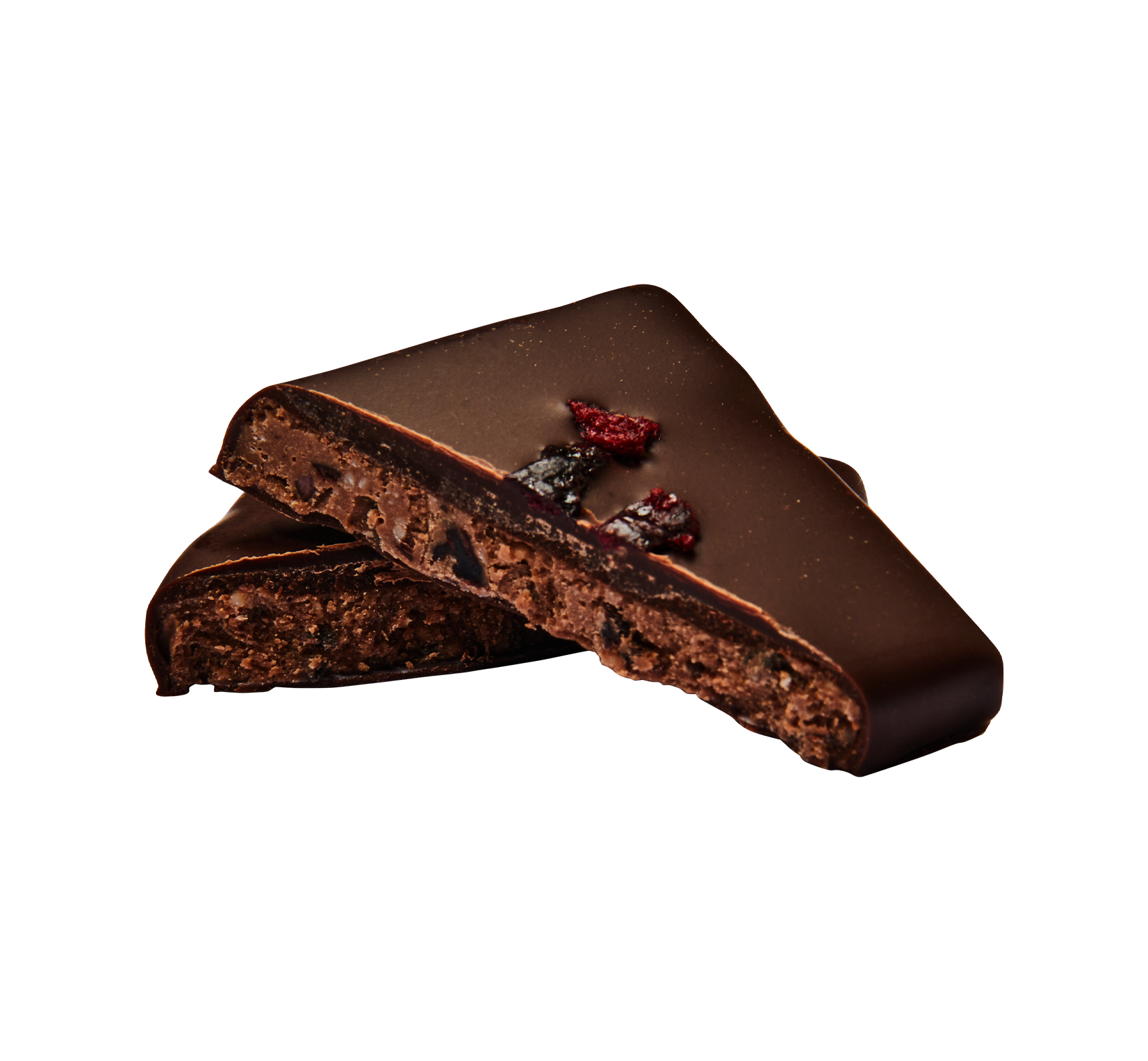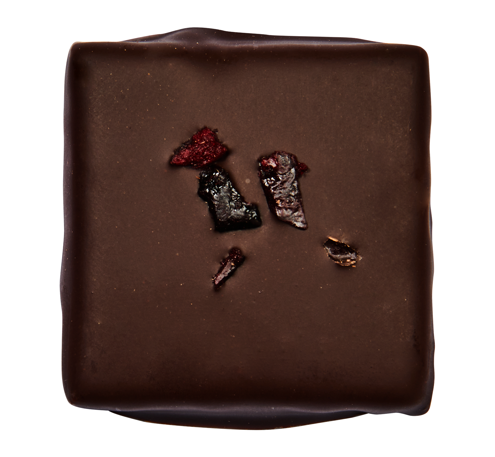 • Große dunkle Schokoladenquadrate, gefüllt mit Mandelbutter und gefriergetrockneten Kirschen.