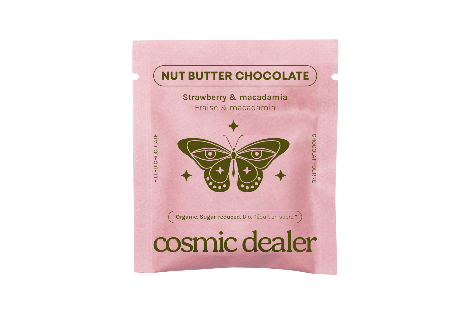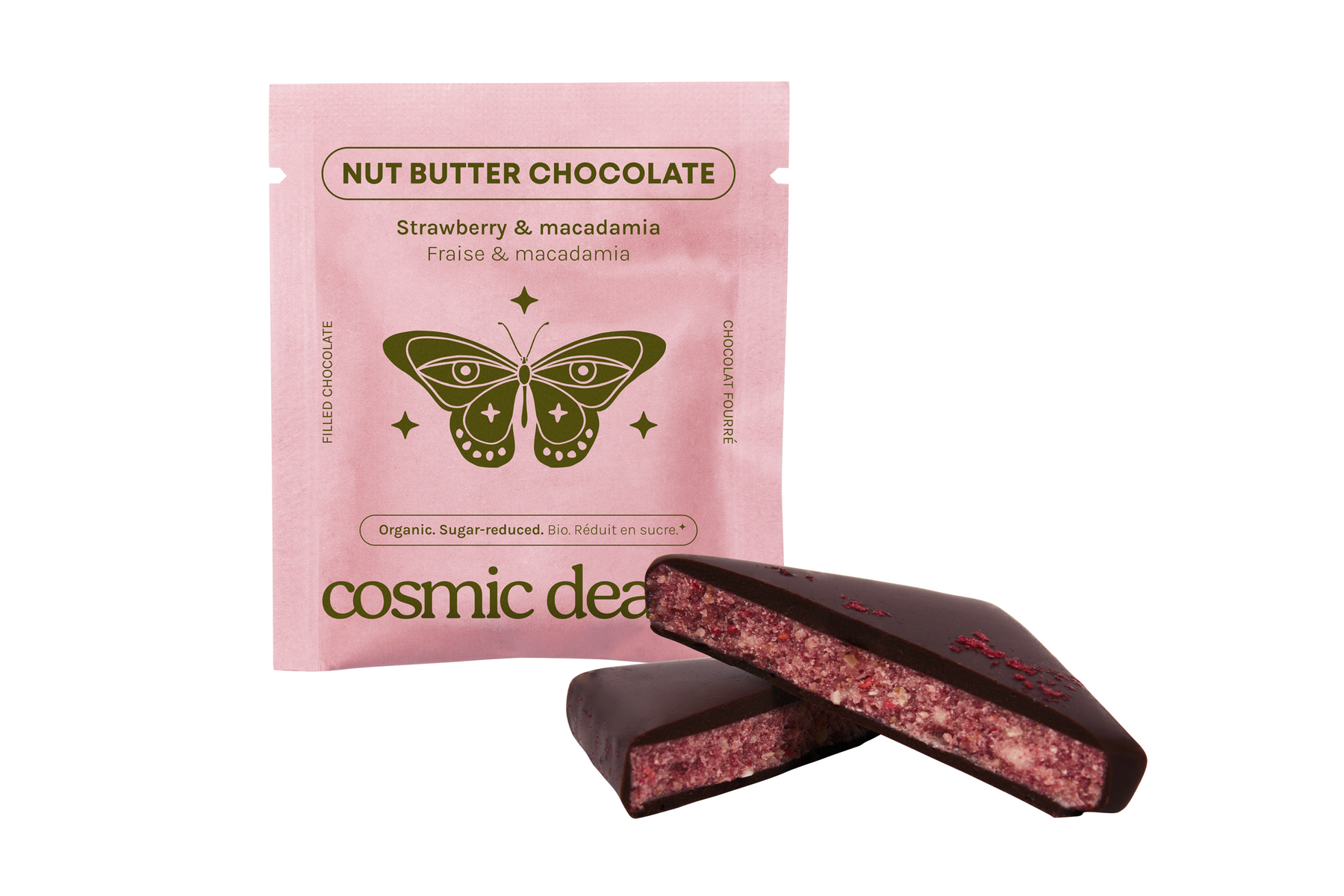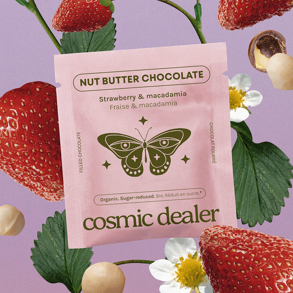 Eine nahrhafte Leckerei, die nahrhafte Macadamianüsse mit gefriergetrockneten Erdbeeren und knusprigem Buchweizen kombiniert – alles getaucht in biologische, sortenreine 75 %ige dunkle Schokolade